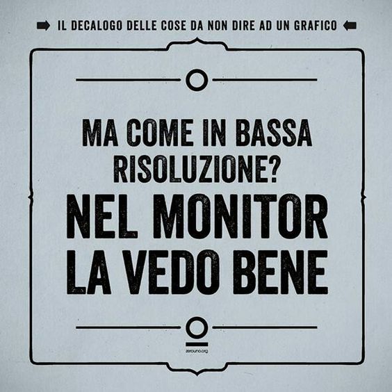 Un classico che se non ripete quelle 20.000 volte a settimana vuol dire che c’è qualcosa che non va… E no, le immagini che si vedono bene a monitor non sempre sono stampabili in alta qualità. La carta e il monitor sono supporti diversi e, se si intende stampare un’immagine, bisogna che abbia una risoluzione sufficientemente alta da non apparire sgranata/sfocata. Il monitor invece, proprio per come è fatto, supporta bene anche immagini piccole e i colori appaiono più vivaci e saturi perché è una fonte luminosa.